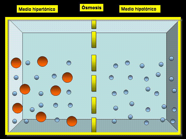 Se puede producir una diferencia de concentración del agua a través de la membrana. Cuando se produce esto, tiene lugar un movimiento neto de agua a través de la membrana celular, haciendo que la célula se hinche o que se contraiga, dependiendo de la dirección del movimiento del agua. Este proceso de movimiento neto del agua que se debe a la producción de una diferencia de la concentración del agua se denomina ósmosis.