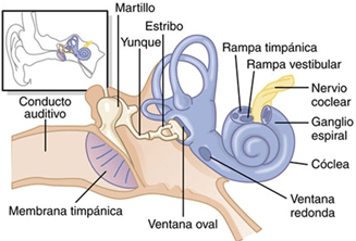 Las fibras nerviosas procedentes del ganglio espiral de Corti penetran en los núcleos cocleares dorsal y ventral situados en la parte superior del bulbo raquídeo. La vía auditiva asciende a través del lemnisco lateral. Parte de las fibras acaban en el núcleo del lemnisco lateral, pero muchas otras se lo saltan y viajan hasta el colículo inferior, donde todas, o casi todas, las fibras auditivas realizan sinapsis. A partir de allí, la vía sigue hacia el núcleo geniculado medial, donde todas las fibras hacen sinapsis. Finalmente, la vía continúa por medio de la radiación auditiva hasta la corteza auditiva, que ocupa básicamente la circunvolución superior del lóbulo temporal. El sistema reticular de activación en el tronco del encéfalo, envía unas proyecciones difusas ascendentes por el tronco del encéfalo y descendentes hacia la médula espinal, y activa todo el sistema nervioso como respuesta a los sonidos fuertes.