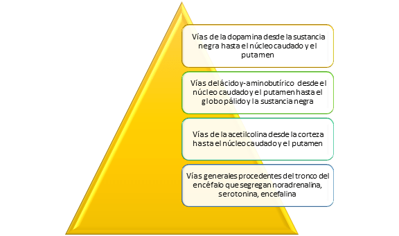 Neurotransmisores específicos con una acción conocida en el seno de los ganglios basales: