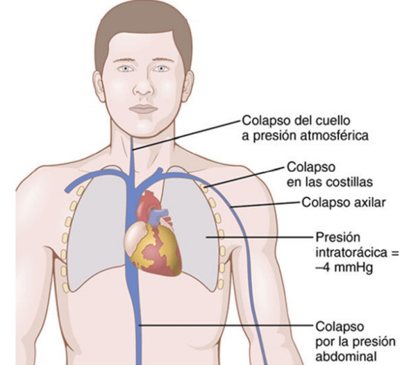 Cuando la presión en la aurícula derecha aumenta por encima de su valor normal de 0 mmHg, la sangre comienza a volver a las venas grandes. Este retorno de la sangre aumenta el tamaño de estas últimas e incluso los puntos de colapso se abren cuando la presión en la aurícula derecha aumenta por encima de +4 a +6 mmHg.