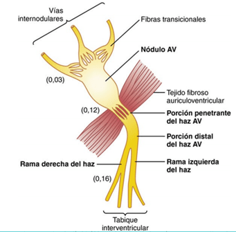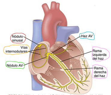 El nódulo sinusal en el que se genera el impulso rítmico normal; las vías internodulares que conducen impulsos desde el nódulo sinusal hasta el nódulo auriculoventricular (AV); el nódulo AV, en el cual los impulsos originados en las aurículas se retrasan antes de penetrar en los ventrículos; el haz AV, que conduce impulsos desde las aurículas hacia los ventrículos, y las ramas izquierda y derecha del haz de fibras de Purkinje, que conducen los impulsos cardíacos por todo el tejido de los ventrículos.