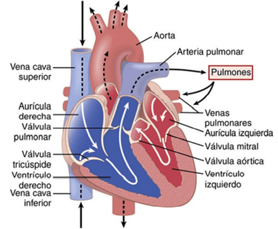 - El corazón, que se muestra está formado realmente por dos bombas separadas: un corazón derecho que bombea sangre hacia los pulmones y un corazón izquierdo que bombea sangre a través de la circulación sistémica que aporta flujo sanguíneo a los demás órganos y tejidos del cuerpo. A su vez, cada uno de estos corazones es una bomba bicameral pulsátil formada por una aurícula y un ventrículo. Cada una de las aurículas es una bomba débil de cebado del ventrículo, que contribuye a transportar sangre hacia el ventrículo correspondiente. Los ventrículos después aportan la principal fuerza del bombeo que impulsa la sangre: 1) hacia la circulación pulmonar por el ventrículo derecho, o 2) hacia la circulación sistémica por el ventrículo izquierdo.