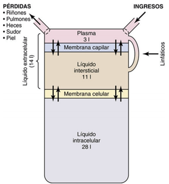 Los seres humanos experimentan una pérdida continua de agua por evaporación de las vías aéreas y por difusión a través de la piel, y en conjunto son responsables de alrededor de 700 ml/día de pérdida de agua en condiciones normales. A esto se le denomina pérdida insensible de agua porque no somos conscientes de ella, aunque se produzca continuamente en todos los seres humanos vivos. La pérdida insensible de agua a través de la piel es independiente de la sudoración y está presente incluso en personas que nacen sin glándulas sudoríparas; la pérdida media de agua por difusión a través de la piel es de unos 300-400 ml/día. Esta pérdida la minimiza la capa cornificada llena de colesterol de la piel, que constituye una barrera contra la pérdida excesiva por difusión. Cuando la capa cornificada se pierde, como ocurre en las quemaduras extensas, la intensidad de la evaporación puede aumentar hasta 10 veces, hasta unos 3-5 l/día. Por esta razón, las personas con quemaduras deben recibir grandes cantidades de líquido, habitualmente por vía intravenosa, para equilibrar su pérdida. La pérdida insensible de agua a través de la vía aérea es de unos 300-400 ml/día. A medida que el aire entra en la vía aérea, se satura de humedad hasta una presión de agua de unos 47 mmHg hasta que se espira. El volumen de sudor es normalmente de unos 100 ml/día, pero en un clima muy cálido o durante el ejercicio intenso, la pérdida de líquidos en el sudor aumenta en ocasiones a 1- 2 l/h. Solo se pierde normalmente una pequeña cantidad de agua (100 ml/día) en las heces. El volumen de orina puede ser tan solo de 0,5 l/día en una persona deshidratada o tan alta como de 20 l/día en una persona que ha bebido cantidades enormes de agua. Esta variabilidad en la ingestión también es cierta para la mayoría de los electrólitos del cuerpo, como el sodio, el cloro y el potasio. En algunas personas, la ingestión de sodio puede ser tan solo de 20 mEq/día, mientras que en otros puede ser tan alta como de 300-500 mEq/día.