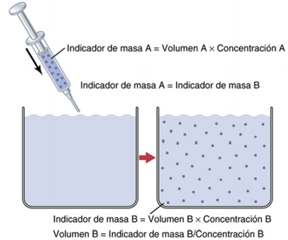 una pequeña cantidad de colorante u otra sustancia contenida en la jeringa se inyecta en una cámara, y se permite que la sustancia se disperse por toda la cámara hasta que se mezcle en la misma concentración en todas las zonas. Después se extrae una muestra de líquido que contiene la sustancia dispersada y se analiza su concentración mediante sistemas químicos, fotoeléctricos o de otro tipo. Si ninguna de las sustancias sale del compartimiento, la masa total de la sustancia en el compartimiento (volumen B × concentración B) será igual a la masa total de la sustancia inyectada (volumen A × concentración A). Mediante un simple reordenamiento de la ecuación, podemos calcular el volumen desconocido de la cámara B como: