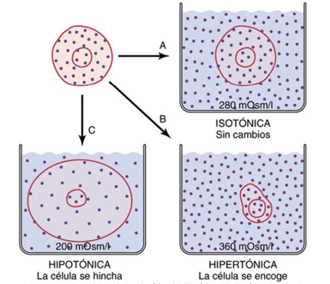 Si se coloca una célula en una solución hipotónica que tiene una menor concentración de solutos no difusibles (menos de 282 mOsm/l), el agua se difundirá al interior de la célula y la hinchará. Si se coloca una célula en una solución hipertónica con una solución mayor de solutos no difusibles, el agua saldrá de la célula hacia el líquido extracelular concentrando el líquido intracelular y diluyendo el líquido extracelular.