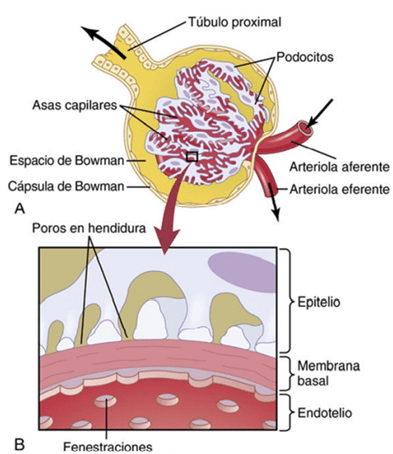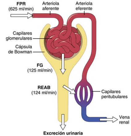 El primer paso en la formación de orina es la filtración de grandes cantidades de líquidos a través de los capilares glomerulares en la cápsula de Bowman, casi 180 l al día. La mayor parte de este filtrado se reabsorbe, lo que deja únicamente 1 l aproximadamente de líquido para su excreción al día, si bien la tasa de excreción renal de líquidos puede ser muy variable dependiendo de la ingestión de líquidos. La alta tasa de filtración glomerular depende de la alta tasa de flujo sanguíneo renal, así como de las propiedades especiales de las membranas de los capilares glomerulares.