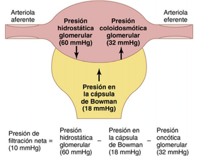 - la suma de las fuerzas hidrostática y coloidosmótica a través de la membrana glomerular, que da lugar a la presión de filtración neta